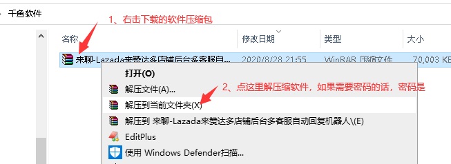 2. 解压缩:右键点击“来聊-Lazada来赞达多店铺后台多客服自动回复机器人.rar“,左键点击”释放/解压到这里“,如果需要密码的话,密码是:1