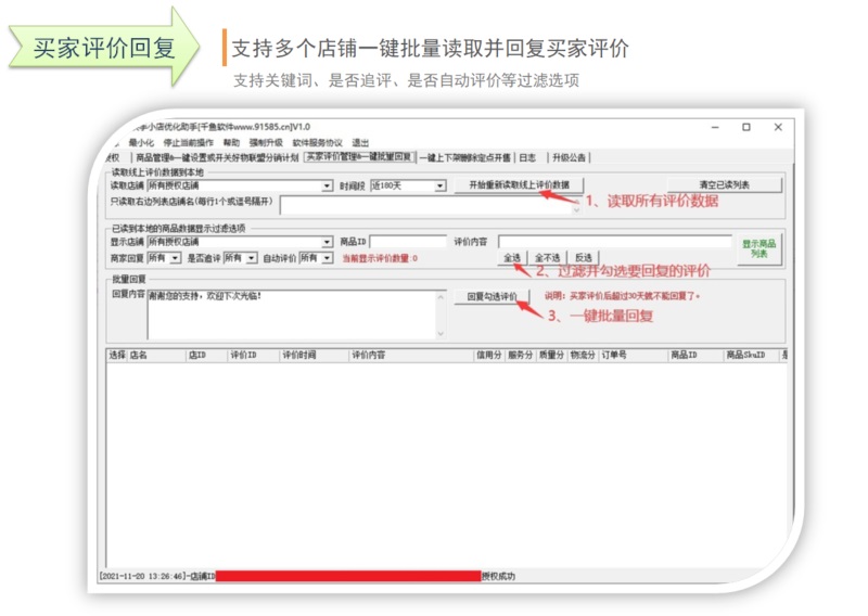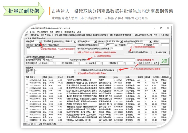 本软件为[千鱼软件www.917e.com]自主开发,可以让快手小店商家一键批量设置修改多店铺商品快分销(好物联盟)佣金、一键批量报名和取消报名团长招商活动、一键回复买家评价、一键商品上下架改定点开售库存价格等。
