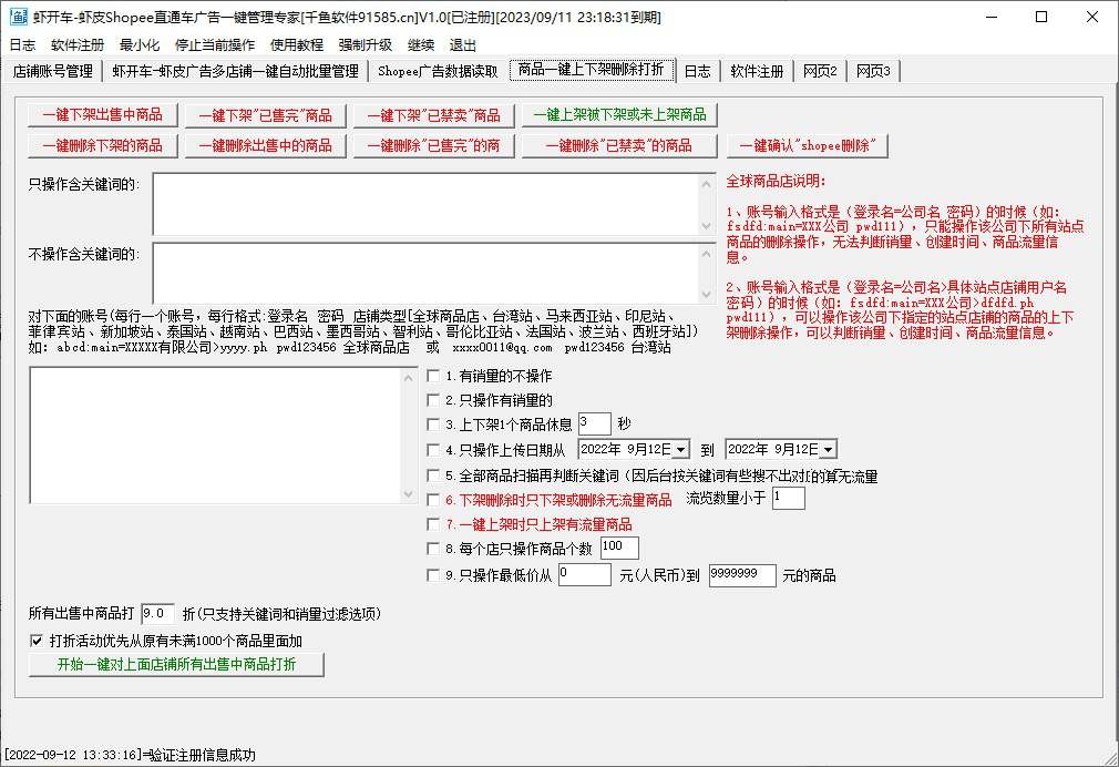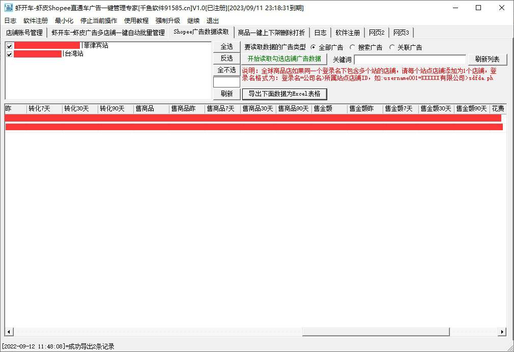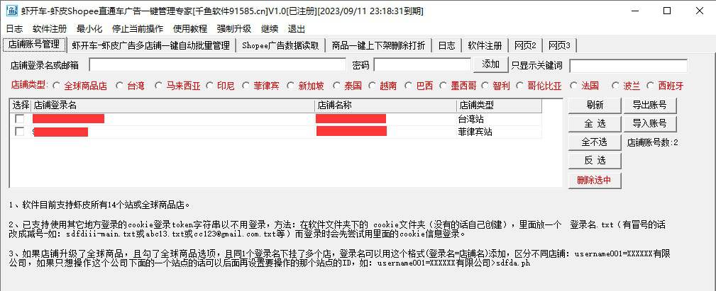 5. 在“店铺账号界面”添加自己的店铺(店类型不要勾错)》在“ 虾开车-虾皮广告多店铺一键自动批量管理 ”界面设置要创建的广告类型、预算、时间长度、关键词和出价》然后点最上面的几个按钮即可一键自动批量操作。另外:“ Shopee广告数据读取 ”界面可以批量读取每个店铺后台广告余额、广告统计数据,“ 商品一键上下架删除打折 ”界面可以进行一些简单的商品批量上下架、删除、打折操作。