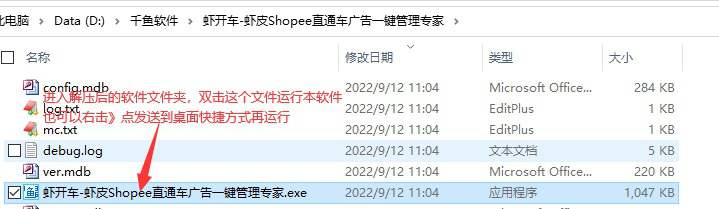 3. 双击解压后的目录“虾开车-虾皮Shopee直通车广告一键管理专家“进入,并双击“虾开车-虾皮Shopee直通车广告一键管理专家”运行本软件