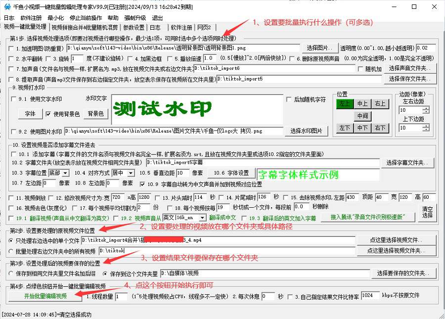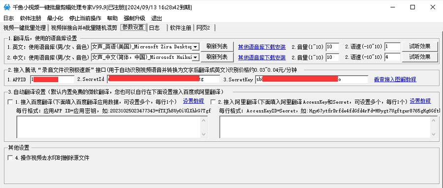 本软件为[千鱼软件www.917e.com]自主开发,可以一键对指定文件夹下的所有视频或单个视频按设置的选项进行一键将语音自动翻译成英文或从英文、日语、越南语、马来语、印尼语、泰语、葡萄牙语、土耳其语、阿拉伯语、西班牙语、韩语等外语翻译成中文并自动加字幕、水平翻转、旋转、加透明图、改播放倍速、删除或添加声音、提取声音文件、打水印、去除水印、附加字幕文件为字幕、视频倒放、修改视频尺寸、删除片头或片尾指定时长、灰度化、视频分割为多个文件、多视频合并拼接(支持44种转场效果或随机转场)等批量剪辑相关操作。可多种操作选项同时进行。