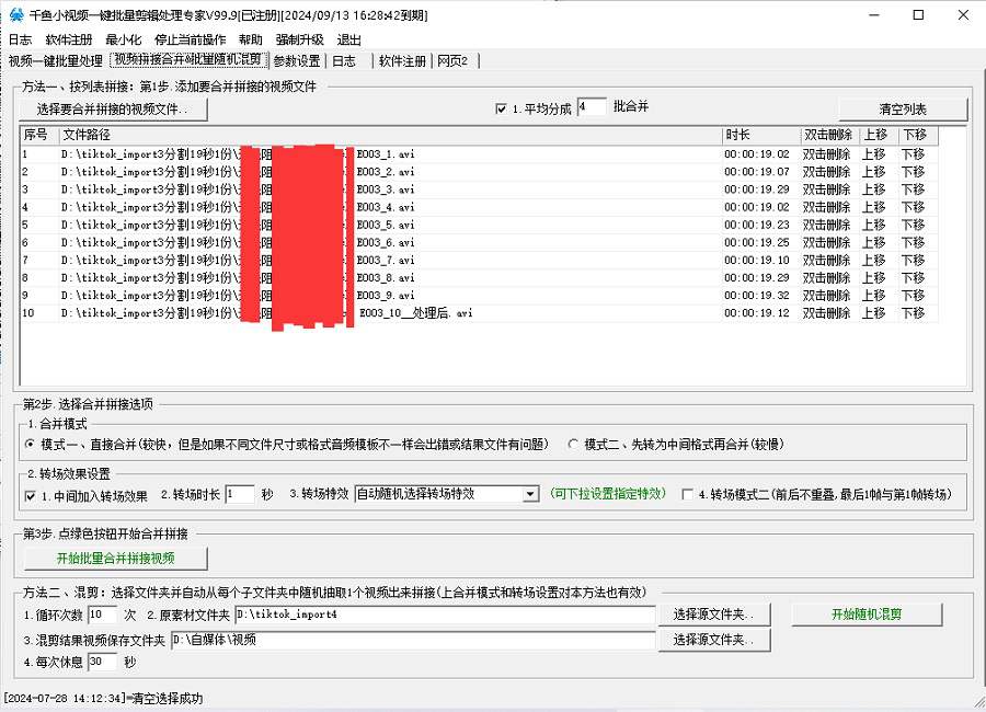 最新版新增功能:在“视频拼接合并”界面最下面增加了“批量随机混剪”功能,可自动从指定文件夹下的每个子文件夹中各随机取出一个视频拼接成指定数量的新视频。