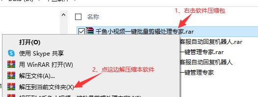 2. 解压缩:右键点击“千鱼小视频一键批量剪辑处理专家.rar“,左键点击”释放/解压到这里“,如果需要密码的话,密码是:1